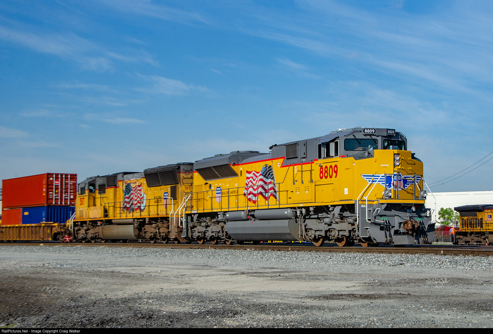 Union Pacific SD70ACe 8809 and SD70M 5117 have coupled on to train KLBG4 11 and will soon depart the railroad's Dolores Yard to their train, which originated in nearby Long Beach, to Elwood, Illinois', Global 4 intermodal facility. This SD70ACe was built by EMD in February 2013. (Carson, California – June 11, 2013)