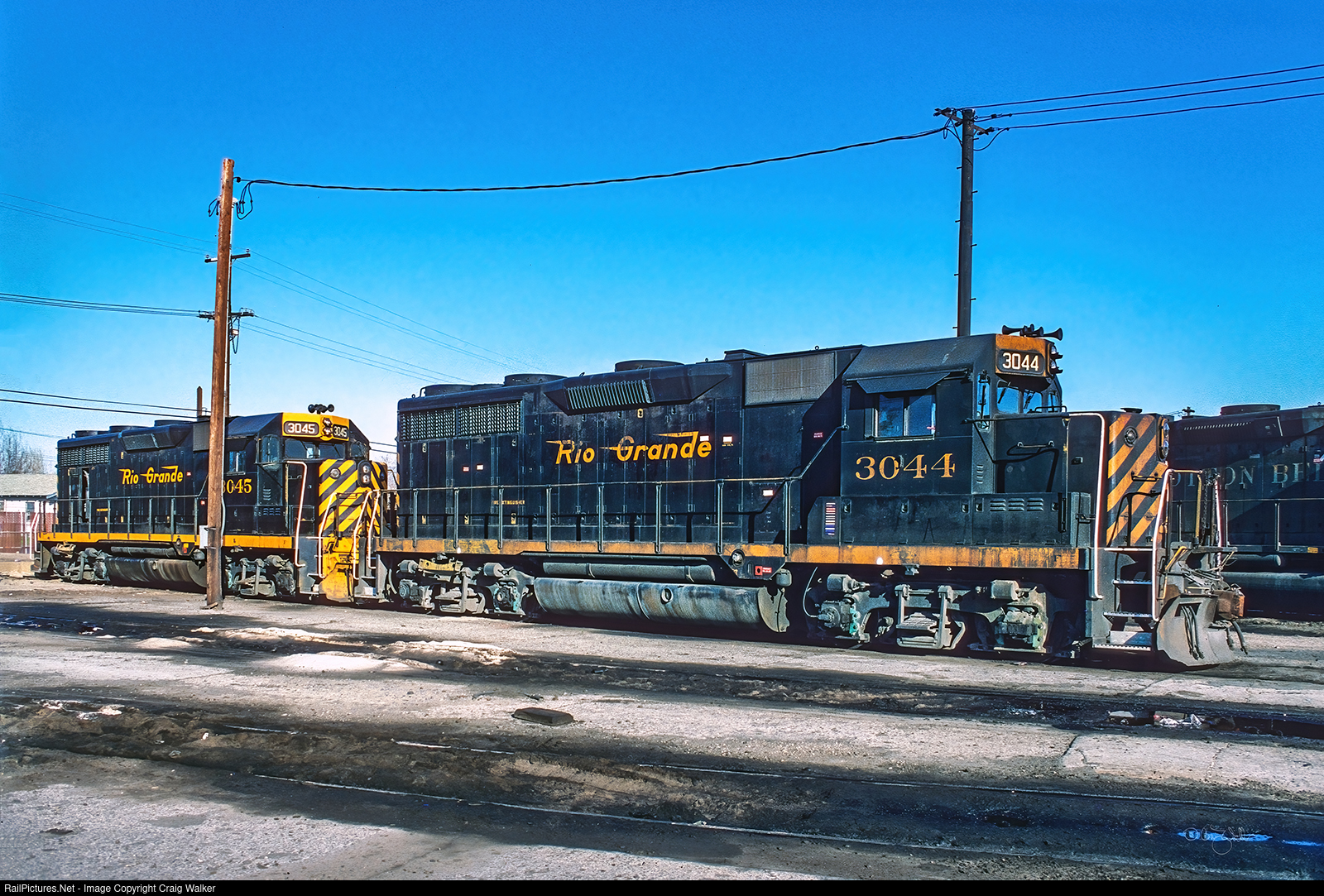 Parked on the whiskers of the turntable in Southern Pacific’s Bakersfield yard are a pair of consecutively numbered Denver & Rio Grande Western GP35s: 3044 and 3045. What were the odds? By this date in 1993, the D&RGW was operated as a separate division of the Southern Pacific, but now with a single owner, the power was mixed freely. (Bakersfield, California – March 14, 1993)