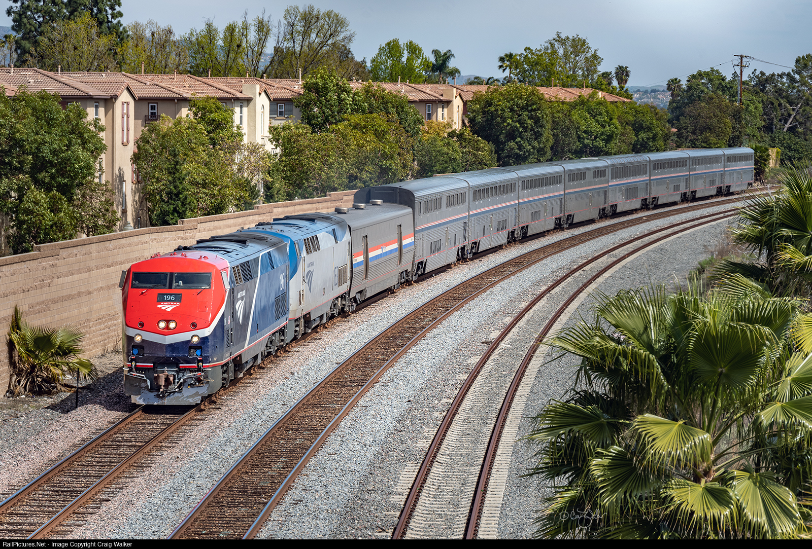 Roughly three miles from the station in Fullerton, the Chief has Phase VII-painted P42DC 196 leading, teamed with P42DC 153, pulling this nine-car train. (Placentia, California – March 16, 2025)