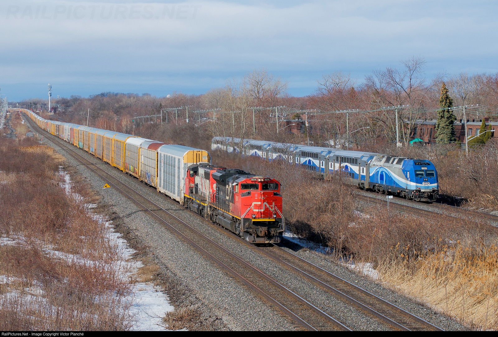 | CN SD70M-2 8014 (built 2005) is leading extra train 276 with a 100% autoracks train. Behind 8014 is SD40-2W 5273, a rare presence in the east for this unit. On the right, an outbound EXO commuter train is running towards Vaudreuil. |