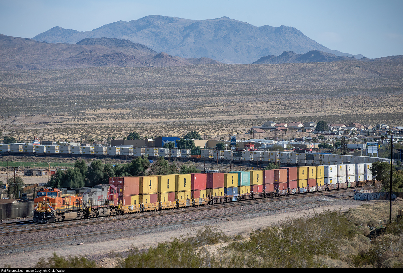 Passing through the wide-open Mojave Desert is BNSF railway train Q-ATGLAC7-24V approaches the yard in Barstow, where the power will most likely get refueled as the crew is relieved with a fresh crew to take this train, which originated in Atlanta, Georgia, the final 150 miles to Los Angeles, California. A pair of Dash 9-44CWs diesels is powering this train: BNSF 4542 and 787, built two years apart (4542 in September 1999 and 787 in September 1997). Looking at all these containers makes one realize just how many trucks are not spewing fumes along our Interstate highways, as railroads are much more fuel efficient and exponentially cleaner to operate. Just counting the container visible here, this train is easily replacing 150 big rigs! (Barstow, California – March 1, 2025)