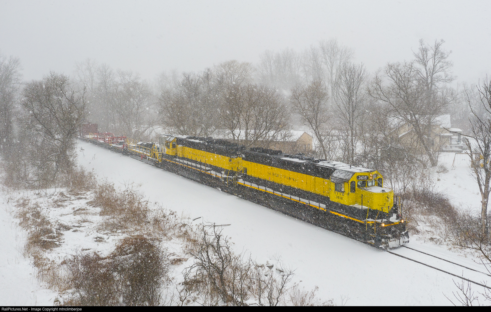 With a heavy snow squall rolling through the valley, the New York, Susquehanna & Western's CL-1 job has departed from Cortland and is nearing the end of their speed restrictions as they approach Blodgett Mills, New York. The railroad's two SD45's provide the power, taking an empty welded rail trainset and one covered hopper to Binghamton.