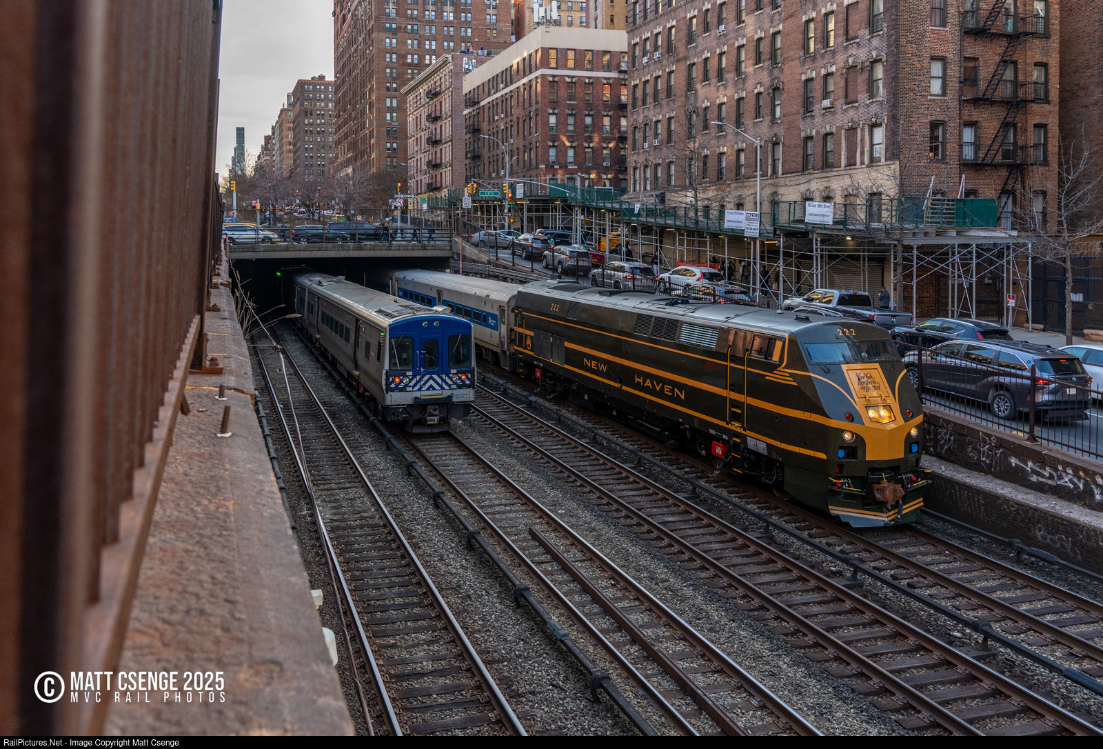 Metro-North Railroad P32AC-DM no. 222 is seen blasting out of the Park Avenue Tunnel portal at E 97th St as a well-timed - or poorly-timed, depending on perspective - M7A train enters. The locomotive is the railroad's newest heritage unit, sporting the pre-war paint scheme of the New York, New Haven & Hartford Railroad, which ran commuter service between New York and New Haven, New Canaan, Danbury, and Waterbury, as well as extensively throughout New England. New Haven Railroad EP-2, EP-3, and EP-4 electric locomotives would have been a common sight here, sporting this paint scheme as they raced trains out from the terminal.