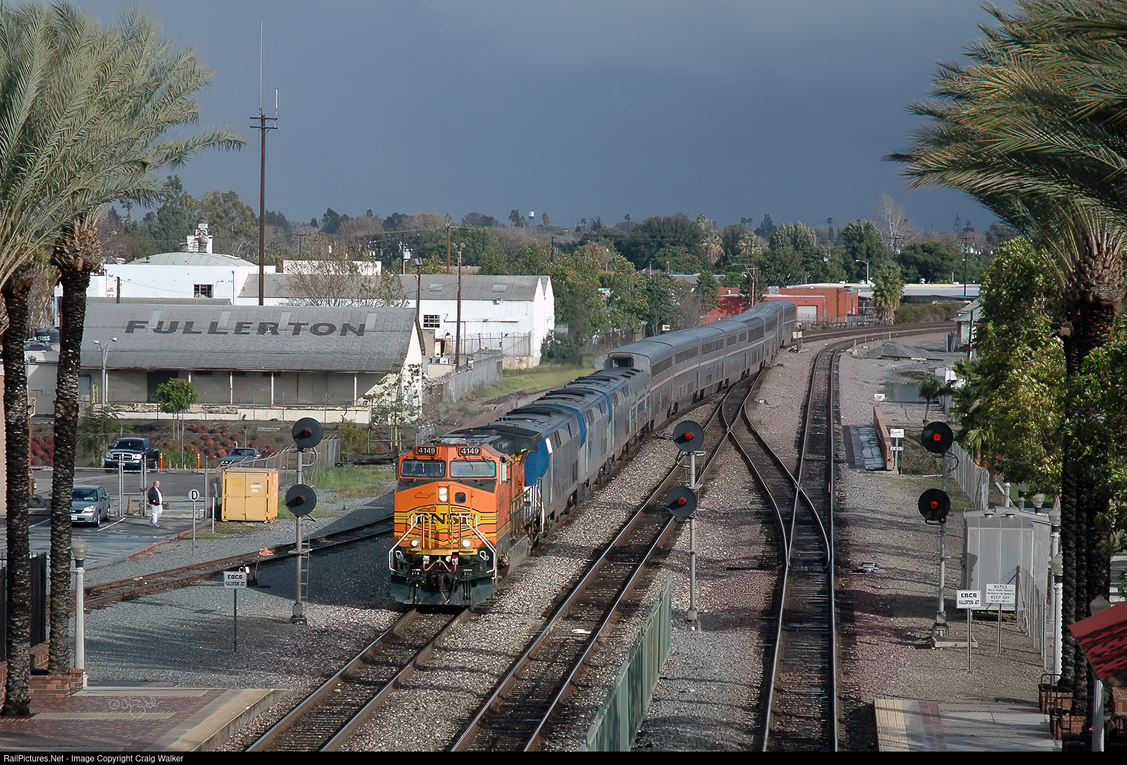 Amtrak train 3, the Southwest Chief, departed Chicago with two operating P42DCs (93 and 116), one dead-heading unit (113) and 10 cars. By the time the Chief got to Colorado, 116 had died, and 113 could not be started. So FURX SD40-2 8130 was added. But … it was cut off in Barstow, and BNSF Dash 9-44CW 4149 was added. By that time, however, the damage was done as the train was now over 7 hours late into Los Angeles. As the morning's rain has stopped, that's a small – extremely small – consolation for the passengers. (Fullerton, California – January 27, 2008)