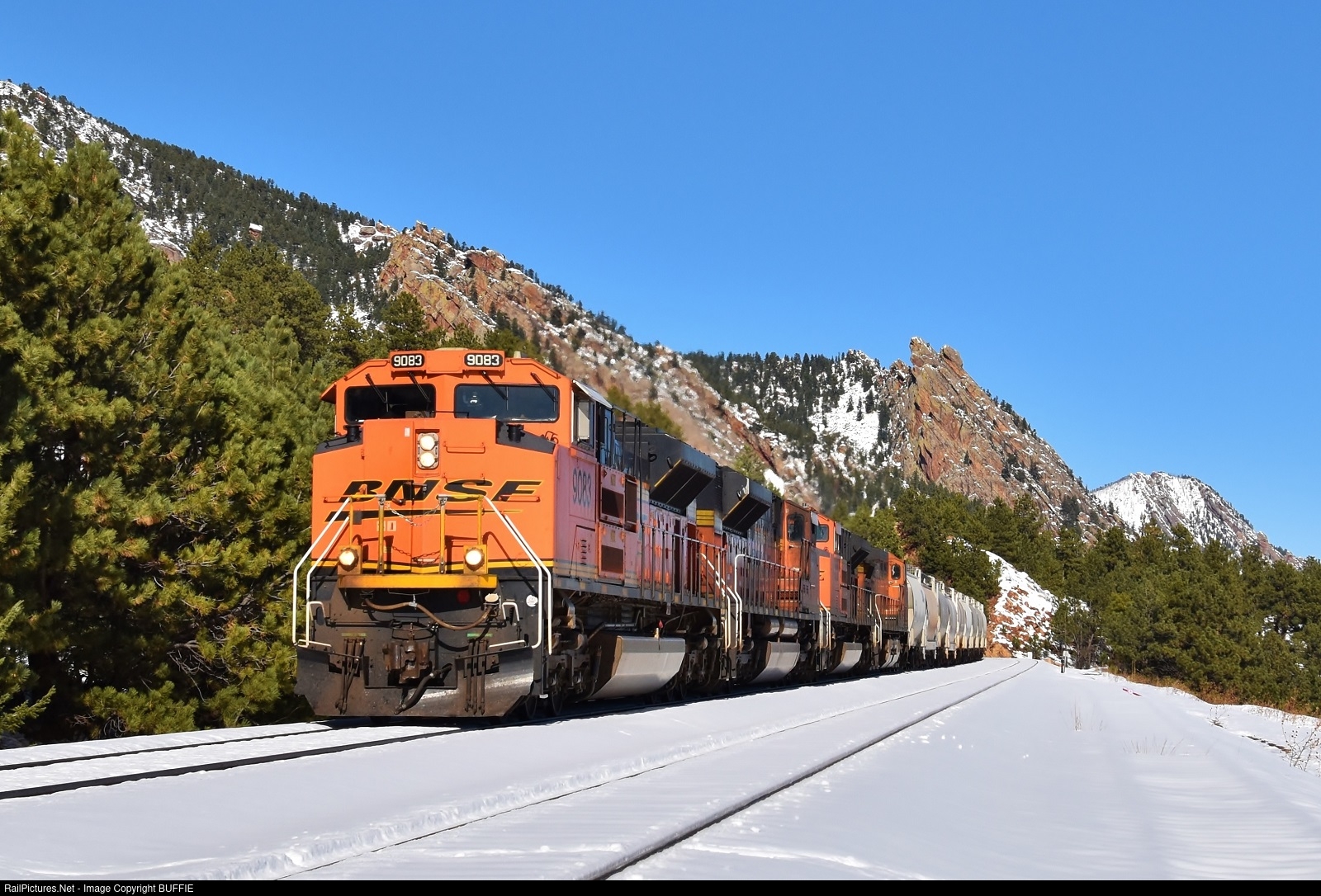 | BNSF 9083 (SD70ACe) leads a freight past the Boulder Flatirons rock formation as it heads towards Plainview, Colorado on the Moffat Tunnel Sub.