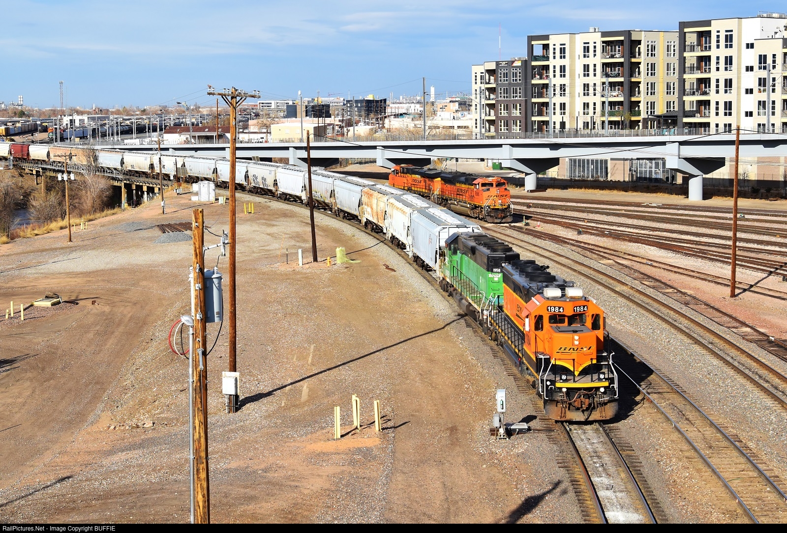 BNSF 1984 (SD40-2) works a string of hoppers in the yard in downtown Denver, Colorado.