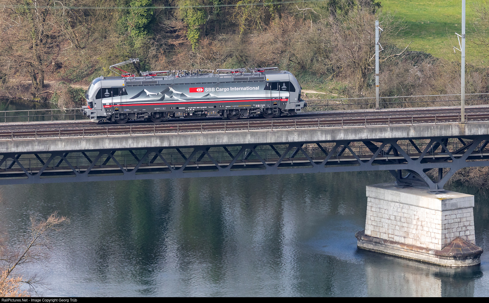 | Siemens "Vectron XLoad" 193 # 458 of SBB Cargo International, rented from SüdLeasing, is running light as 29246 from Basel shunting yard to Cornaux, crossing the Aare river on the bridge in Olten. |