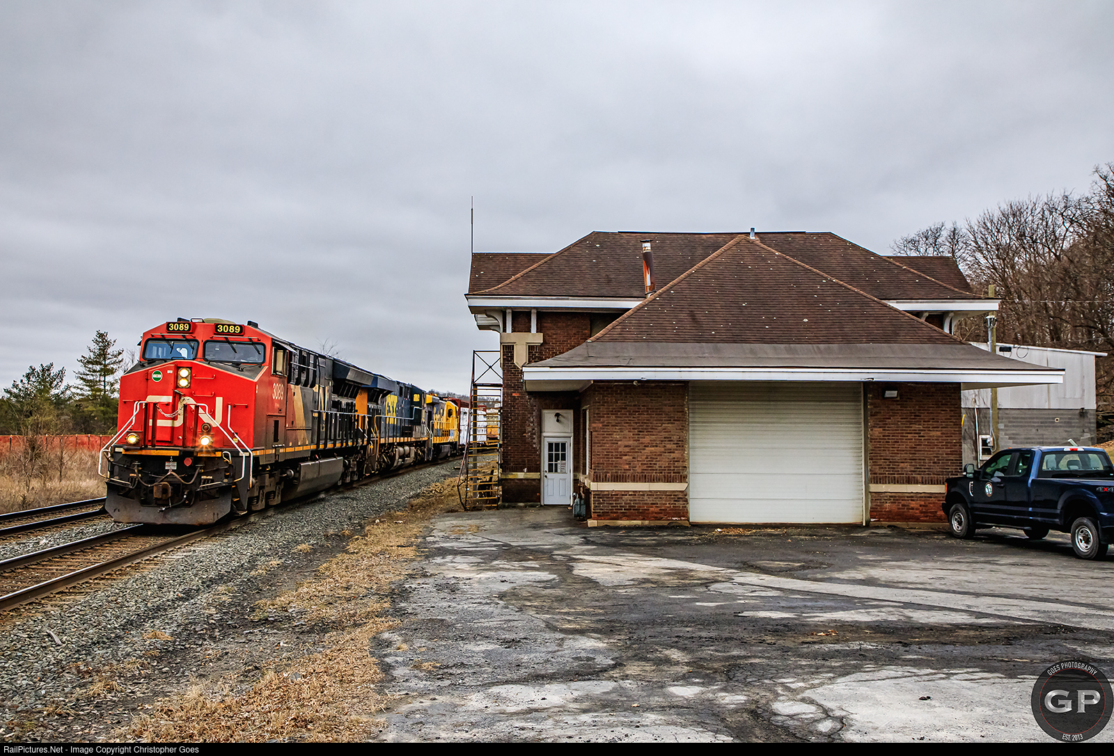 | At the former West Shore Railroad Ravena Depot now the Department of Public Works Sewer & Streets Garage; CSXT M404 with a unique lashup of three different railroads rolls northbound past the old station. CN 3089 proudly leads and though somewhat rare power for the area, the celebrity of the day was SMS Lines SLRS 4211 B23-7 former ATSF Blue Bonnet dead in tow being brought up to Selkirk from New Jersey to eventually be delivered by L020 to the Guilderland Northeast Industrial Park. |