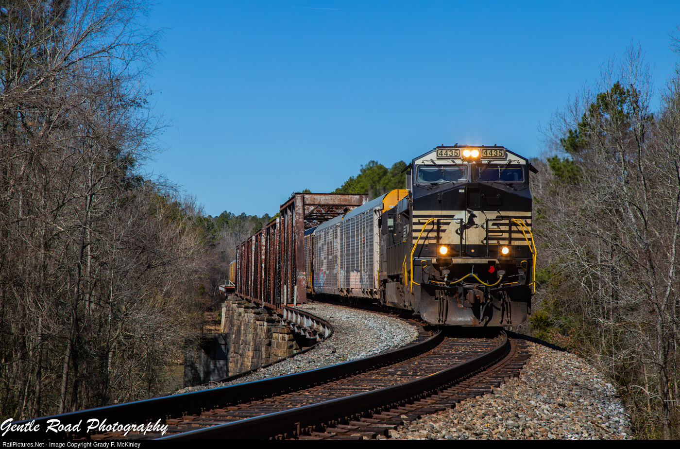 | NS 18D crosses the Broad River at Shelton, SC filled with new BMW's from the Greer plant for export at Charleston, SC. |