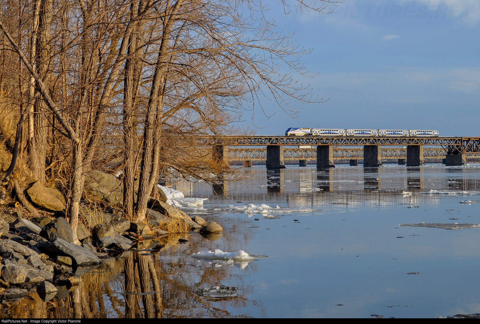 | EXO 1327 is deadheading to the Sortin yard after having made a commercial trip to Candiac, and crosses the bridge over the Saint-Lawrence river at LaSalle. |