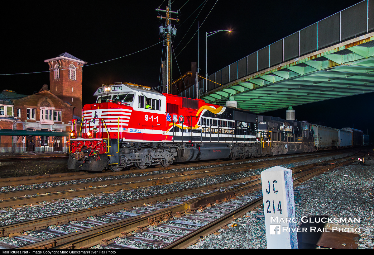 Emergency Response. On the night of December 1, 2017, Norfolk Southern SD60E 911 led train 28N into Binghamton, New York, seen here passing the former Delaware, Lackawanna, and Western Railway station and the "JC 214" milepost, denoting 214 miles from Jersey City, New Jersey. The locomotive would be used the next day to lead the Capital Region Toys For Tots Train from Binghamton to Schenectady, but its assignment was a last minute arrangement. Next to "Honoring First Responders" are three logos representing EMS, Police, and Fire Supression. I revisited this previously unpublished photo today in memory of the great night photographer Gary Knapp, who recently passed away. Gary was a modern master of off camera flash photography, and an inspiration to many in the field.
