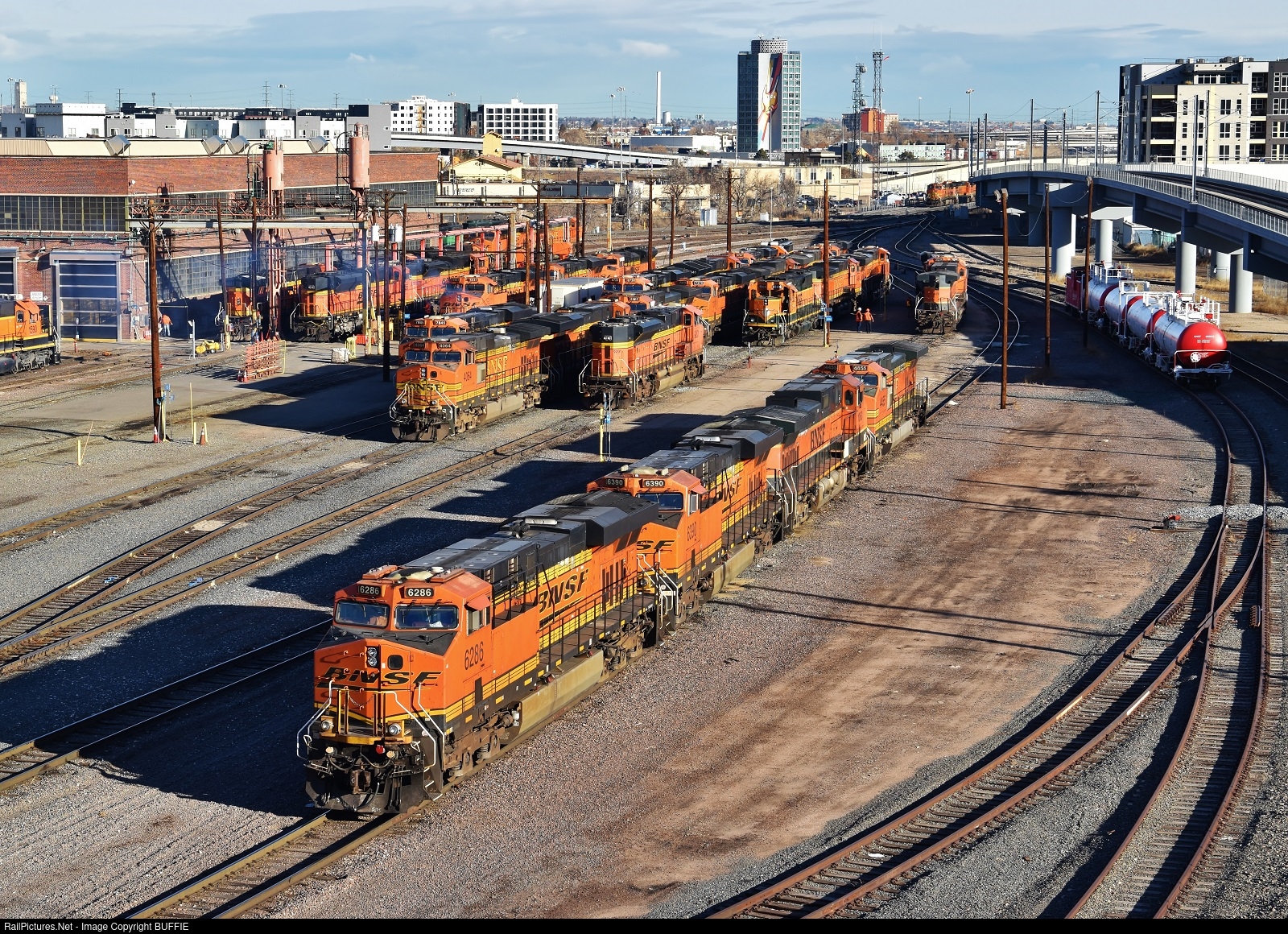 | BNSF 6286 (ES44AC) joins a variety of BNSF motors in the yard of the engine servicing facility in Denver, Colorado.