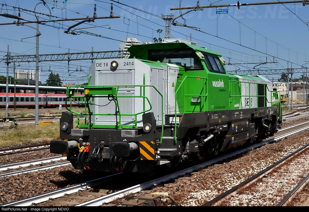 One of the Vossloh DE-18 diesel-electric locomotives in shunting, it belongs to "Mercitalia Shunting & Terminal" This type of locomotive is suitable for shunting service without limitations on all RFI railway lines, it is equipped with all the on-board systems, to serve from High Speed to non-electrified secondary lines.