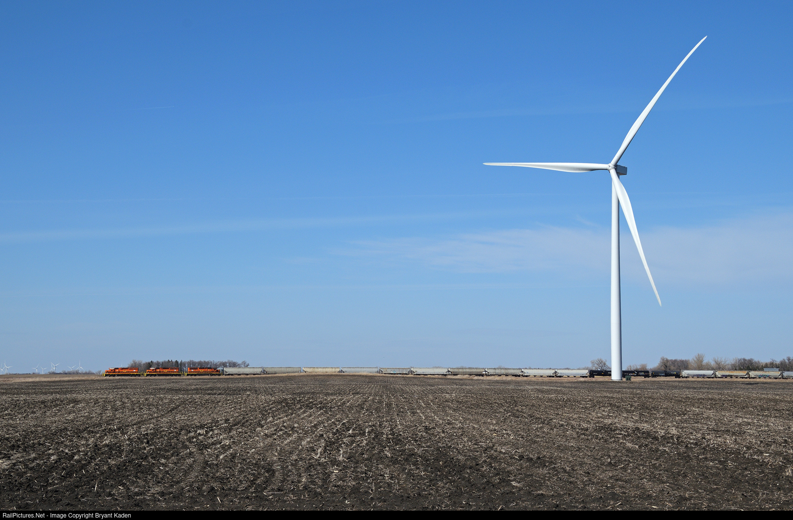 A westbound RCPE train is seen passing one of the large wind turbines that are found throughout southwest Minnesota. Pictures don't really do justice to how massive these structures are.