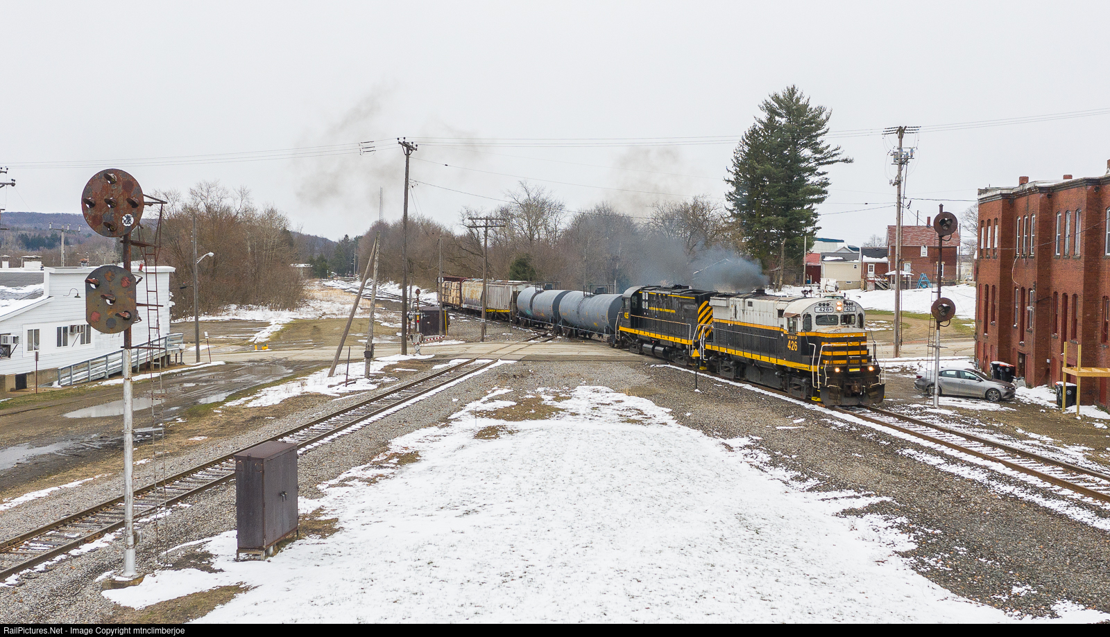 | A late season snow has covered the ground as the second to last WNYP Falconer Turn pounds the diamond in Corry, Pennsylvania led by a former BRC C424. The heritage of the lines here is evident with the two different signal installations, with position lights governing the B&P's ex PRR line, while Conrail era trilights guard the WNYP's ex Erie line. |