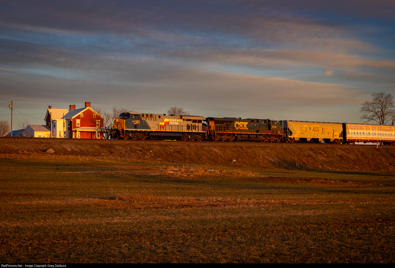 M372, a CSX reroute due to the Howard Street Tunnel Project, with the Seaboard System" heritage unit at the helm, heads just north of Maugansville just before sunset. This photo was taken from private property with permission.