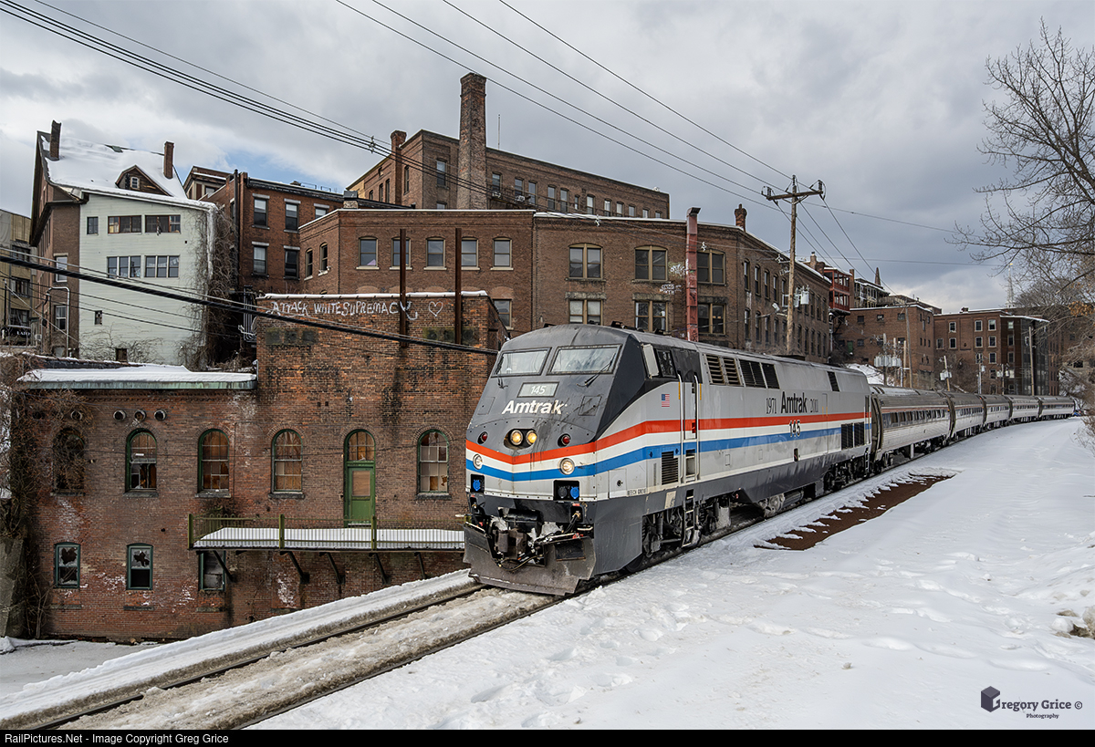 On February 24th, 2024, Amtrak P42DC #145, painted in Phase III heritage, leads southbound Vermonter Train 57 past the historic Arch Street Generating Station building complex in Brattleboro, Vermont on the New England Central Railroad (NECR) Palmer Subdivision.