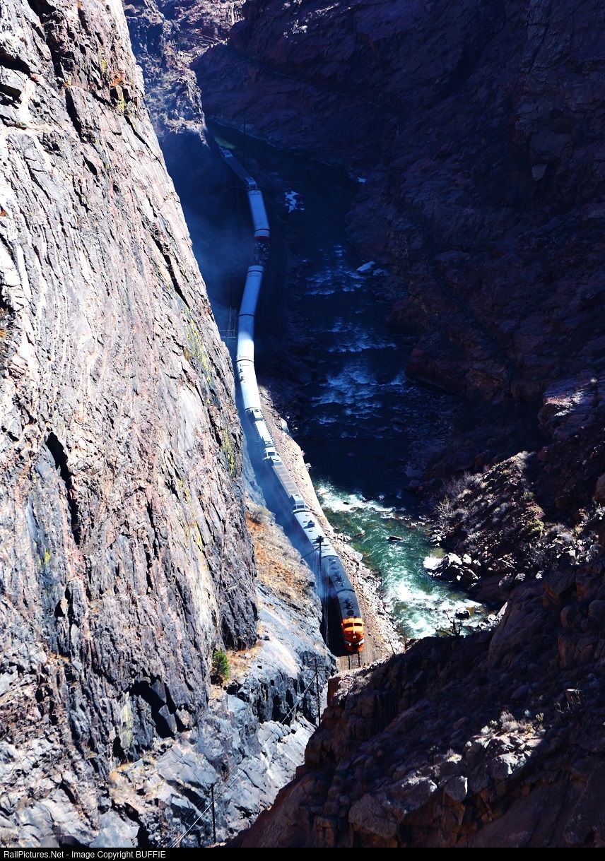The Royal Gorge Railroad runs on the track next to the Arkansas River over 1,000 feet below the photographer.