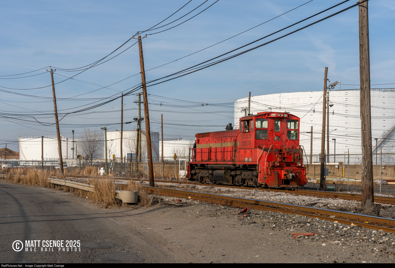 East Jersey Railroad & Terminal Co. SW1500 no. 321B is seen running light up the Constable Hook Industrial Track from the iMTT chemical facility on the south side of Constable Hook.