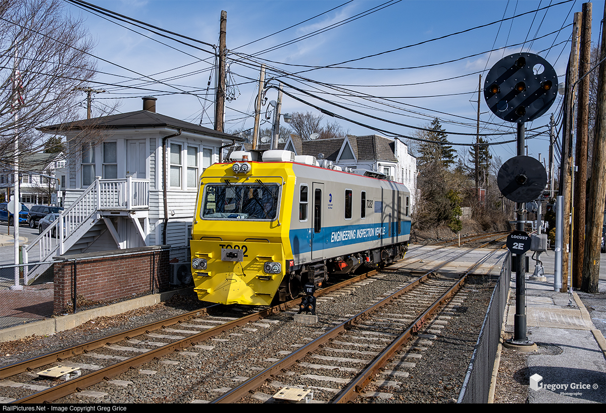 On the morning of February 24th, 2025, Long Island Rail Road's "TC-82" Track Geometry Vehicle heads west past the Locust Interlocking Tower on the Oyster Bay Branch in Locust Valley, New York. The TC-82 is a Track Geometry Vehicle built by Plasser American Corporation for track inspections throughout the Long Island Rail Road system