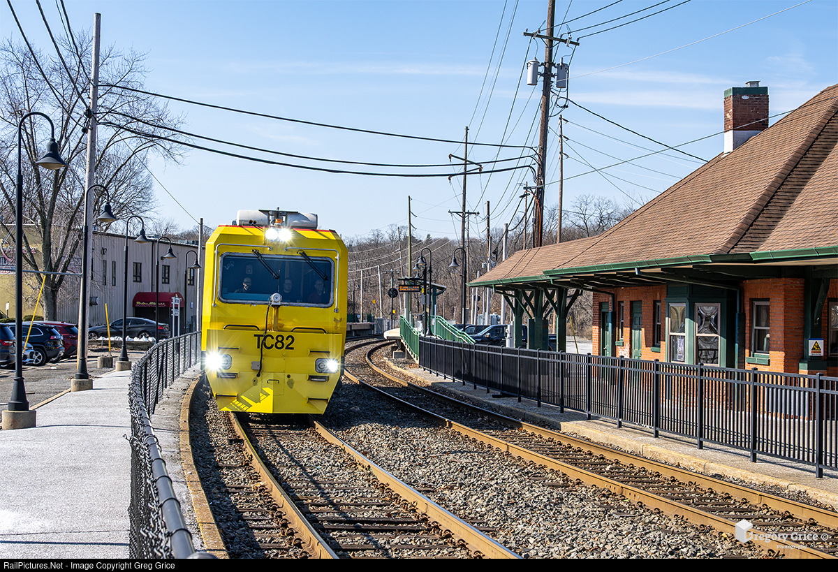 On the morning of February 24th, 2025, Long Island Rail Road's "TC-82" Track Geometry Vehicle heads east past Glen Street station on the Oyster Bay Branch in Glen Cove, New York. The TC-82 is a Track Geometry Vehicle built by Plasser American Corporation for track inspections throughout the Long Island Rail Road system