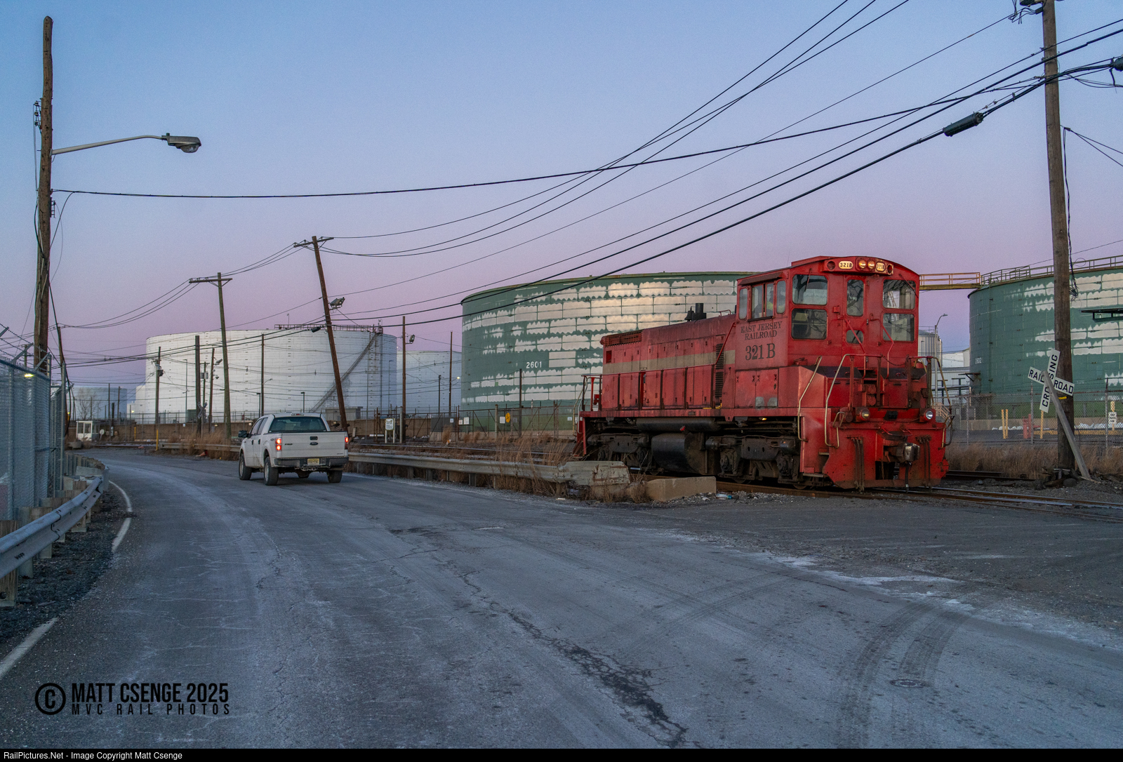 As the light of day fades from the sky, East Jersey Railroad and Terminal Co. SW1500 no. 321B is seen on the Constable Hook Industrial Track, returning to the main iMTT facility after switching the company's chemical plant. |