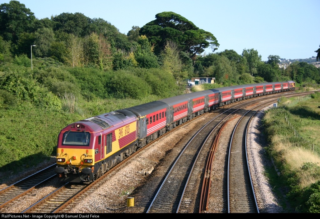 | 67025 "Western Star" slows for a red signal at Aller Junction as it heads an ECS (empty coaching stock) from Paignton to London. Dead on the rear is 67014. |