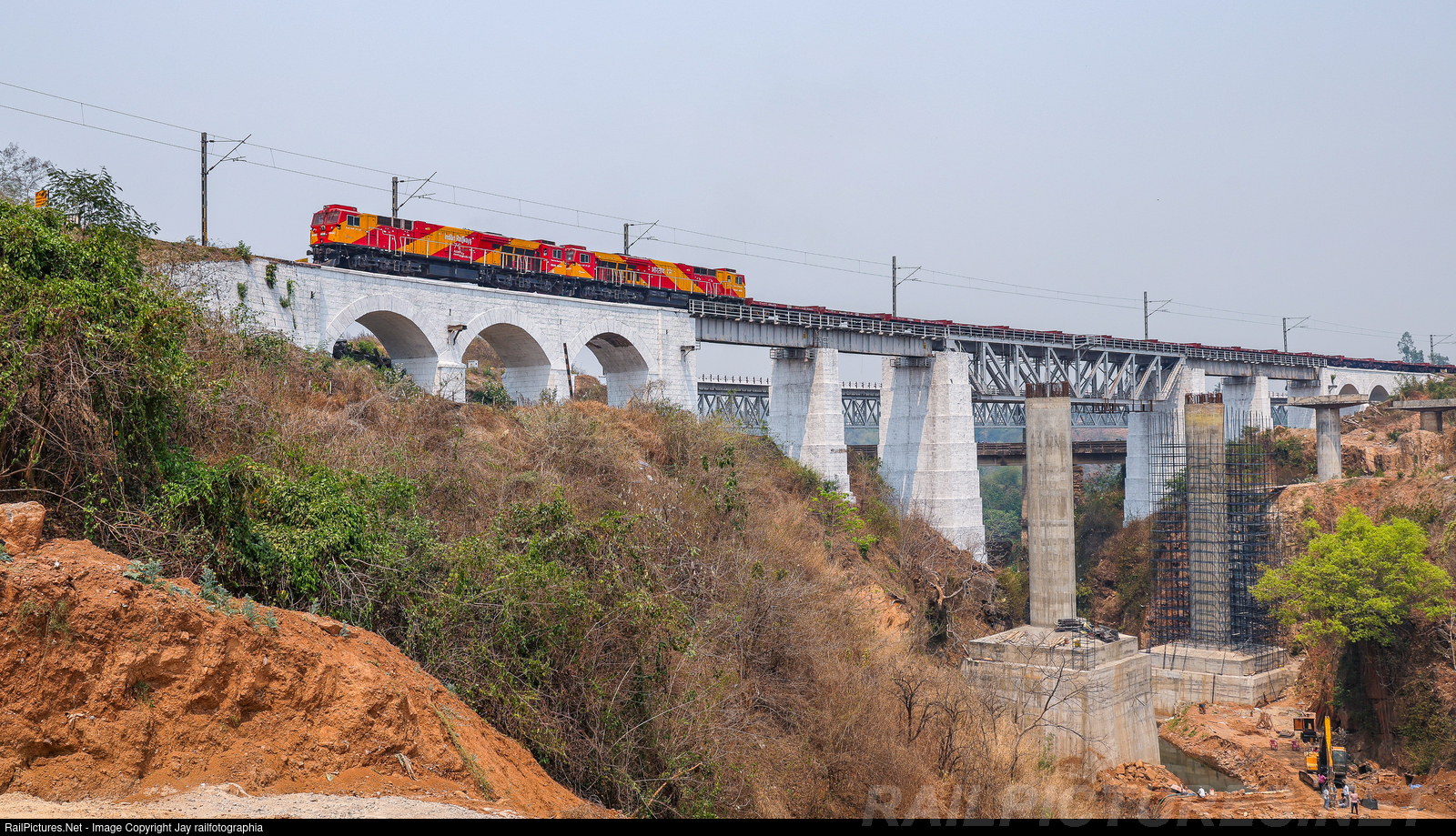 WDG-4G duo, first one manufactured by GE and second one by WABTEC with empty flatbed rake crossing Majhigouri Rayagada railway bridge