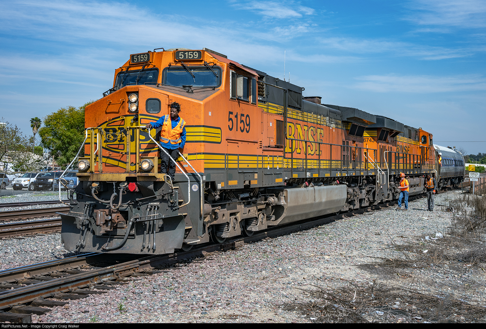 So, nearly 2½ hours after arriving, this train continued to Los Angeles with a single diesel (BNSF Dash 9-44CW 5159) pulling DOTX 216 by itself. Moments after it departed, repair crews were already arriving to evaluate the 6743's seized traction motor. (Fullerton, California – March 25. 2025)