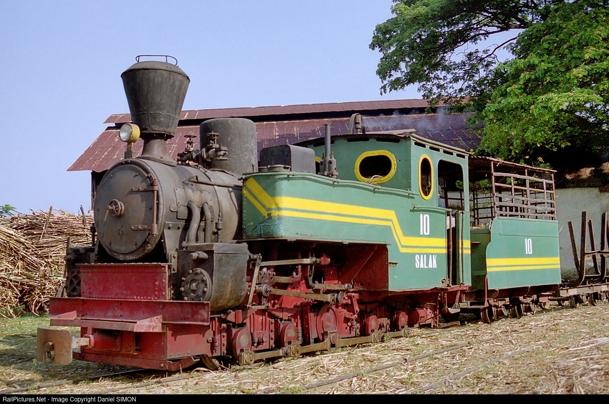 | Rejosari sugar mill (Java, Indonesia) operated an interesting fleet of steam locos including no.10 "Salak" on the 700 mm gauge system. This 0-8-0T featured a jackshaft which was driven by the cylinders which in turn provided power to the driving wheels via a gear train between the 2nd and 3rd axles. Built by Orenstein & Koppel in 1916 in Germany it was a powerful loco especially at low speeds around the mill. |