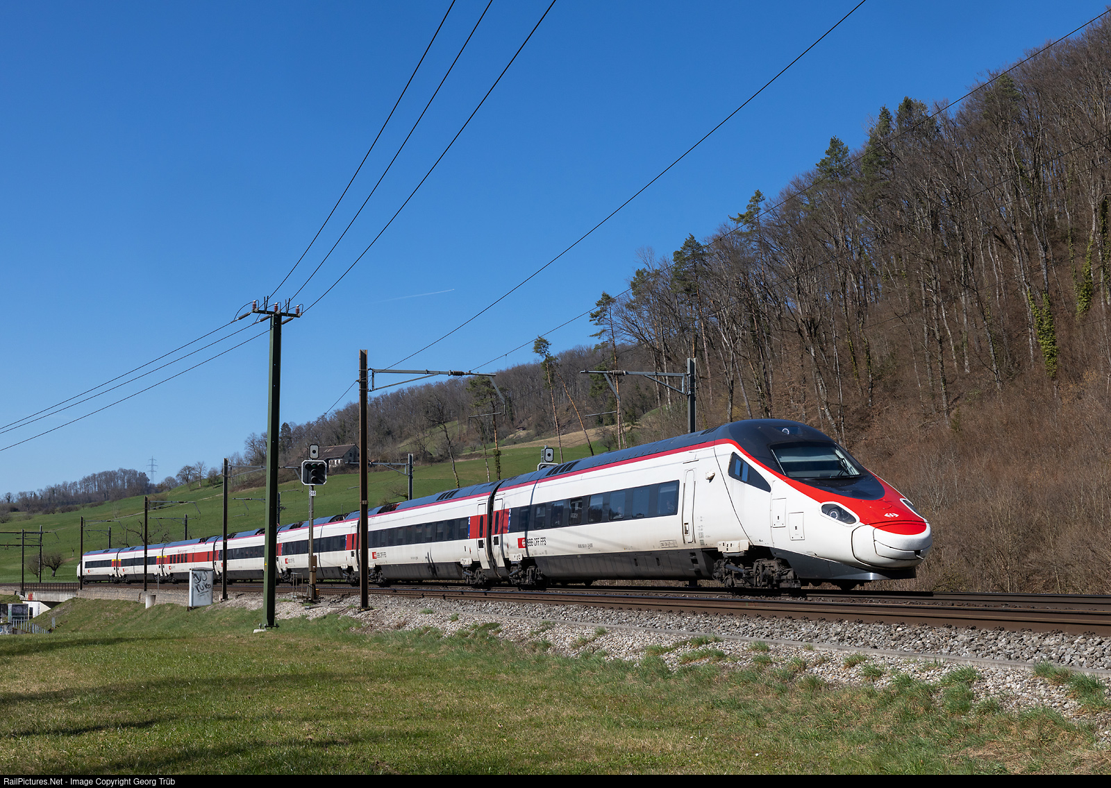 | "Astoro" highspeed tilting train RABe 503 # 011 of the SBB is running the IC 775 from Basel to Zürich on the Hauenstein line between Gelterkinden and Tecknau. |
