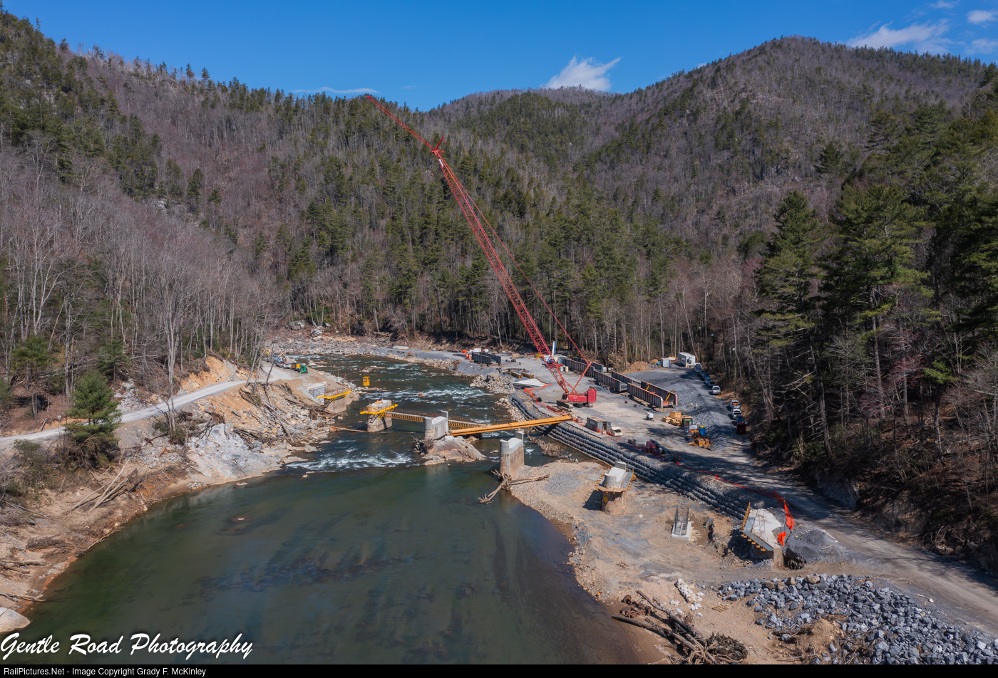 Crews work 7 days a week to shore up and raise bridge piers on the washed-out bridge at Poplar over the Nolichucky River on the former Clilnchfield mainline damaged during Hurricane Helene.