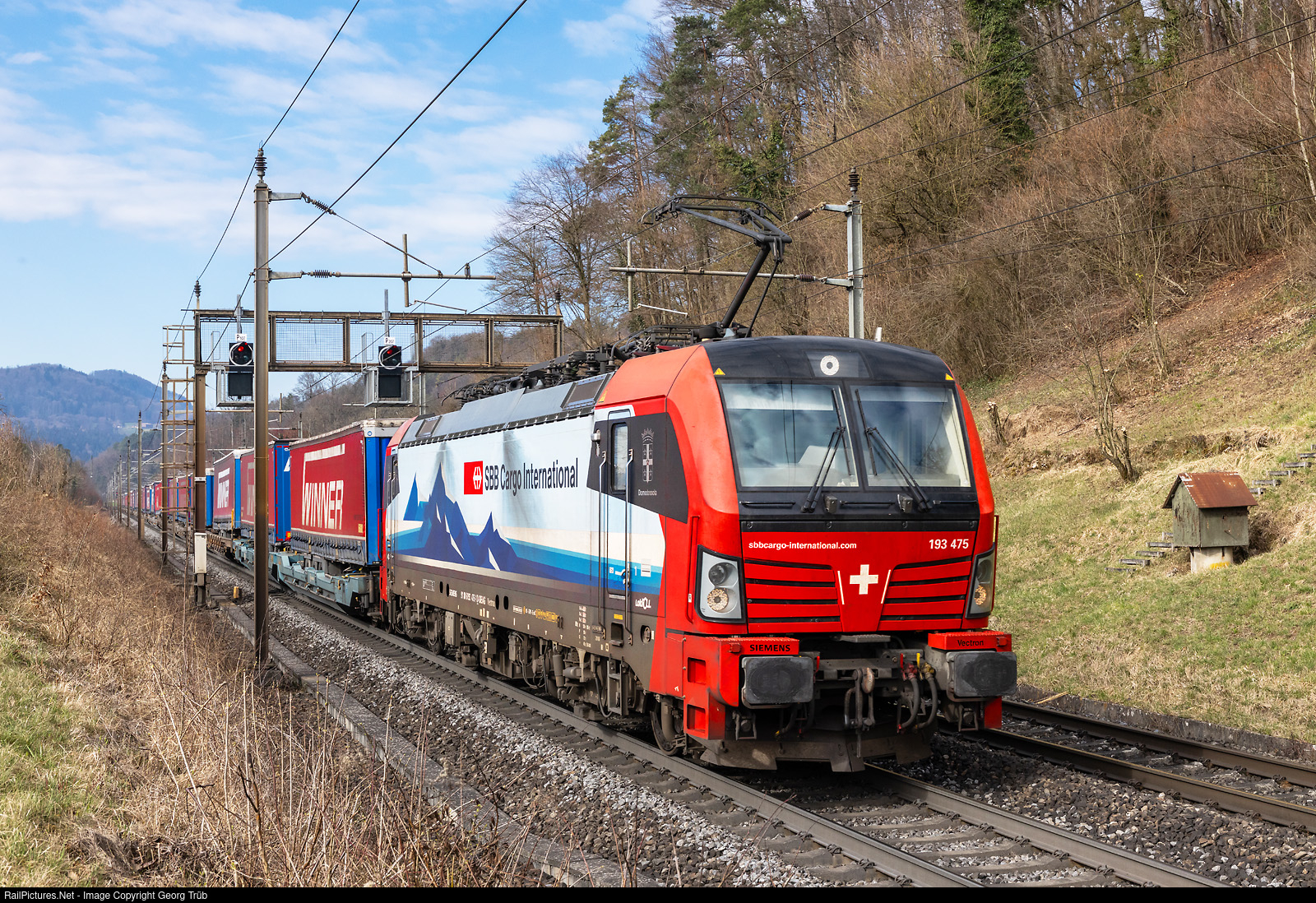 | Siemens "Vectron" 193 # 475 of SBB Cargo International, rented from the LokRollAG, pulls the southbound "Winner" intermodal train 42001 from Wuppertal/Germany via Basel-Gotthard-Ceneri-Chiasso to Piacenza/Italy, on the Bözberg south ramp near Umiken, between Schinznach Dorf and Brugg VL. |