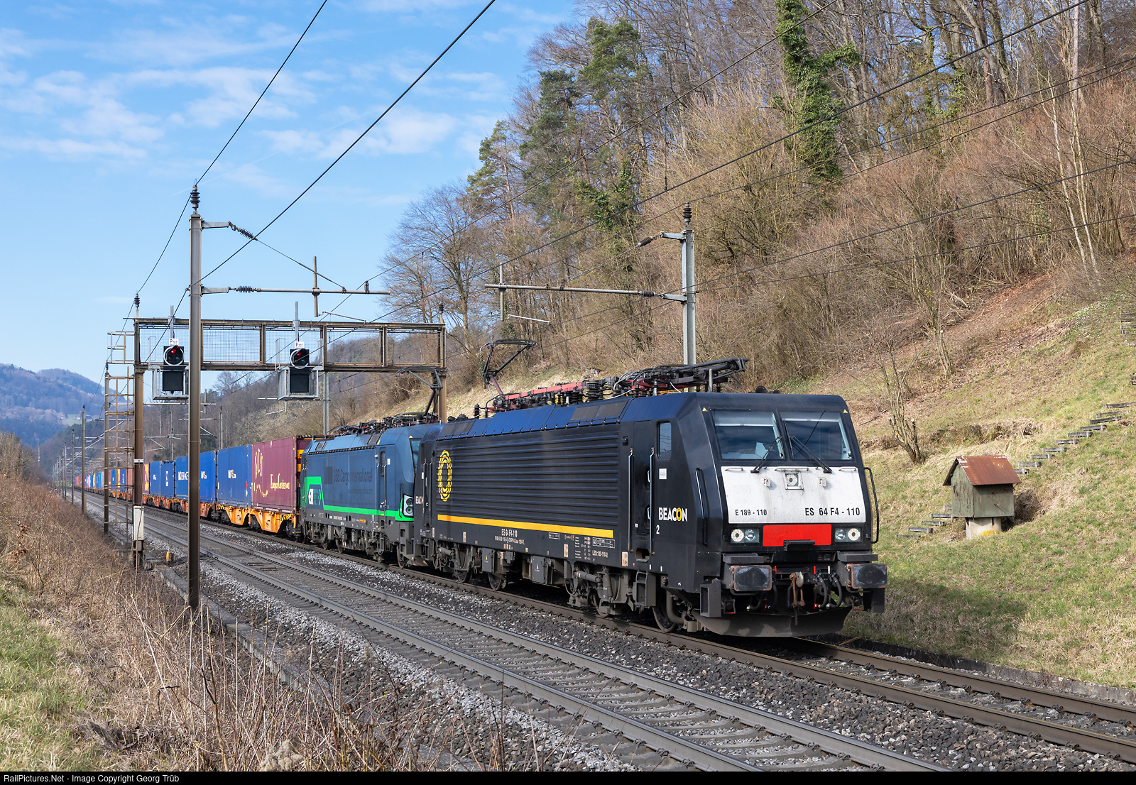 | Southbound intermodal freight train 40123 of SBB Cargo International from Basel Badischer Bahnhof via Gotthard-Ceneri to Chiasso freight yard, on the Bözberg south ramp near Umiken, between Schinznach Dorf and Brugg VL. Pulling are Siemens Eurosprinter ES64 F4 # 110 (E 189 # 110) of the Beacon Rail and Siemens Vectron 193 # 257 of the ELL (European Locomotive Leasing). |