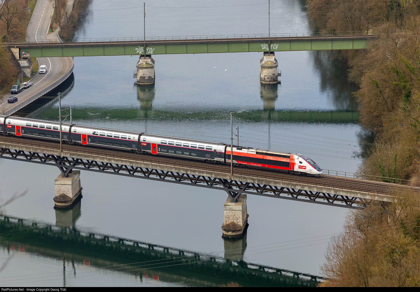 | TGV 2N2 # 4729 of the Lyria is crossing the Aare in Olten on the 118 meter long bridge, wchich was built new in 2002/2003. This is the Hauenstein base line, the train is coming over the joint line Olten and will soon enter the 8,134 kilometer long Hauenstein tunnel to Tecknau. Train TGV 9206 is running from Zürich via Basel-Mulhouse-Belfort-Montbéliard TGV to Paris Gare de Lyon. In the background the single track Aare bridge of the old Hauenstein line via Läufelfingen to Sissach. |