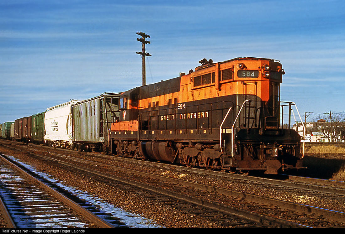 On April 20, 1970 Great Northern SD9 584 is working a long transfer drag through Minneapolis. It's more than two months into the Burlington Northern merger and the SD9 has yet to be renumbered for the BN. Cascade Green will be applied much later. R.R.Wallin photo, from my collection.