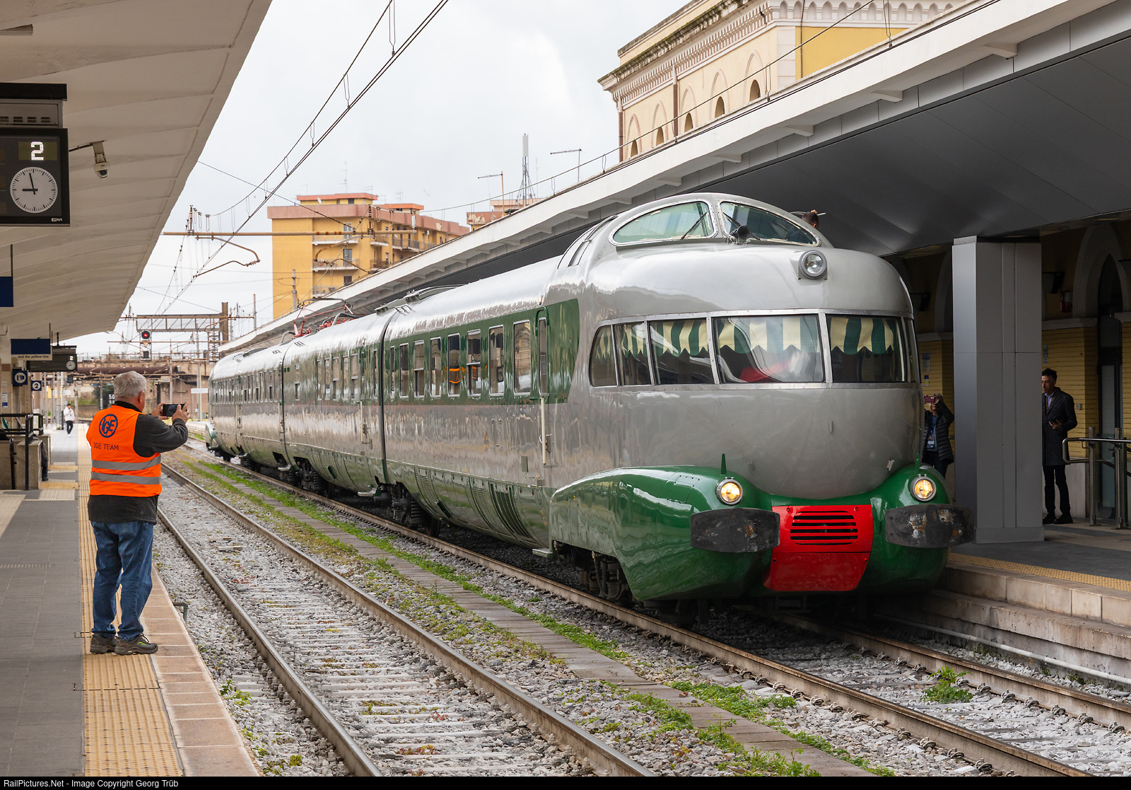 Taranto was one of the southernmost stations on the 4 days round trip around Italy with the fast electric railcar ETR # 252 "Arlecchino" of the Fondazione FS Italiane, organized by the IGE Erlebnisreisen from Hersbruck/Germany. Head of the company, Armin Götz, is picturing "his" train. The train journey this day was from Bari via Taranto-Metaponto-Potenza-Battipaglia-Salerno-Napoli-Frosinone to Roma Termini. The four-car multiple unit with a maximum speed of 160 km/h (formerly 180 km/h) and 1490 kW power from the 3000 V direct current overhead line was built in 1960 by Breda in Milan for the Italian state railroad Ferrovia dello Stato (FS) and was in service until 1998. Four trains were delivered in 1960, when the Olympic Games were held in Rome, ETR # 251 to # 254. The trains were initially used on the Milan-Rome-Naples route as Freccia del Vesuvio. Two units ran coupled between Milan and Rome, one of which continued on to Naples. The three sister vehicles had been broken up by 2001, the ETR 252 has been in operation again since 2019, perfectly refurbished. There is a round viewing platform at both ends, each with 8 freely rotating seats. The driver's cab is located in a cupola above.
