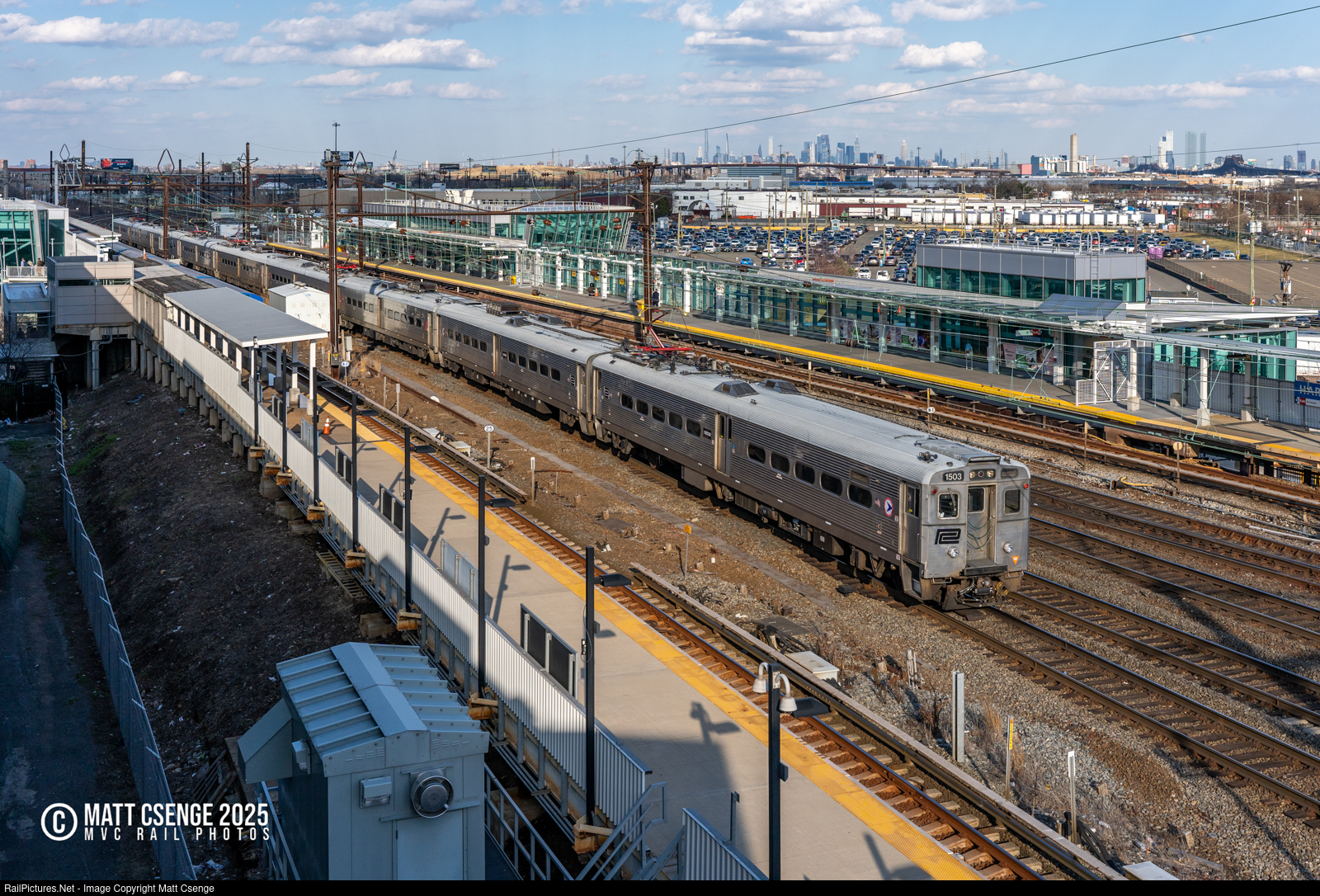 NJ Transit Arrow III car 1503 is the lead unit on Northeast Corridor Line train 3165, seen passing through Harrison Station en-route to Trenton. The unit is decorated with Penn Central and NJDOT logos and lettering, inspired by the scheme that older Arrow models wore under PC ownership - the Arrow III cars were built starting in 1977, and thus missed PC ownership by just one year! |