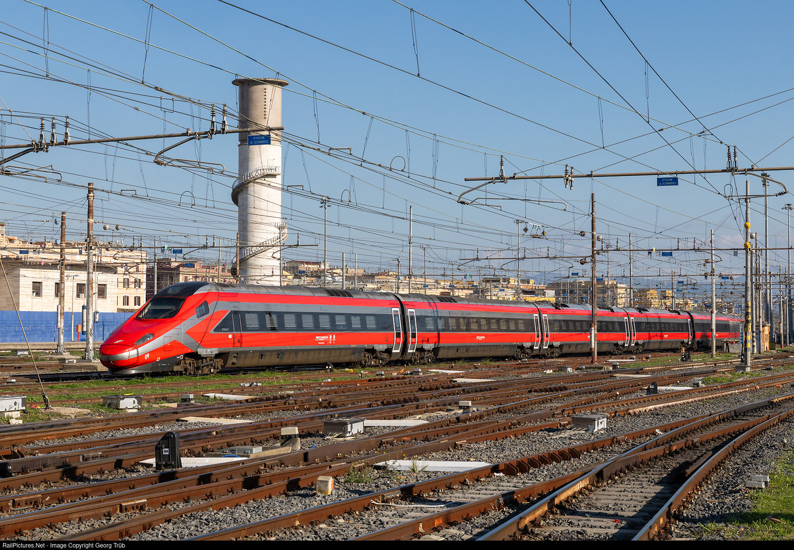| Highspeed tilting train ETR 600 # 009 of Trenitalia is entering Roma Termini as Frecciarossa 9415 from Venezia S.L. via Bologna-Firenze. |