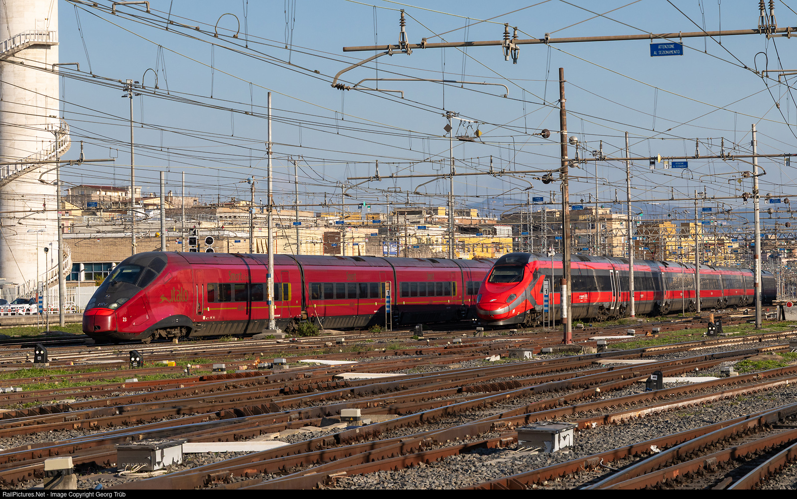 | Italian highspeed tilting trains of the two competitors NTV with "Italo" and Trenitalia with "Frecciarossa" in Roma Termini. On the left ETR 575 # 023 of the NTV for 300 km/h, on the right tilting train ETR 600 # 009 of Trenitalia for 250 km/h. |