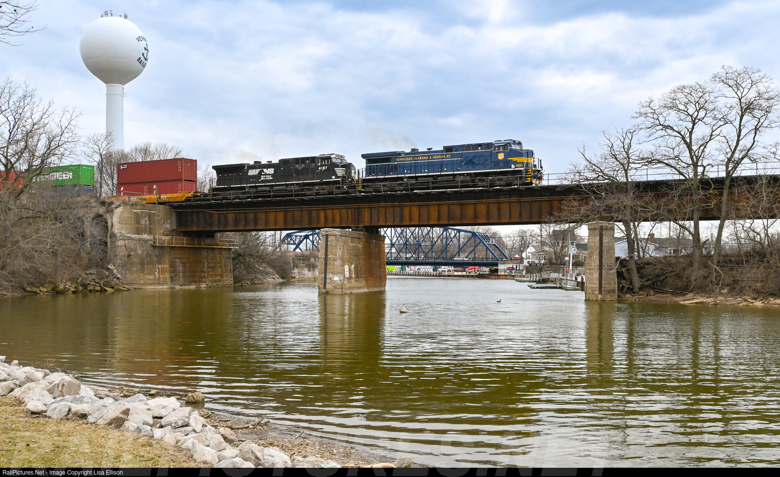| The NS Tennessee, Alabama and Georgia heritage unit, also known as the TAG unit, crosses the Vermilion River in Vermilion Ohio. |