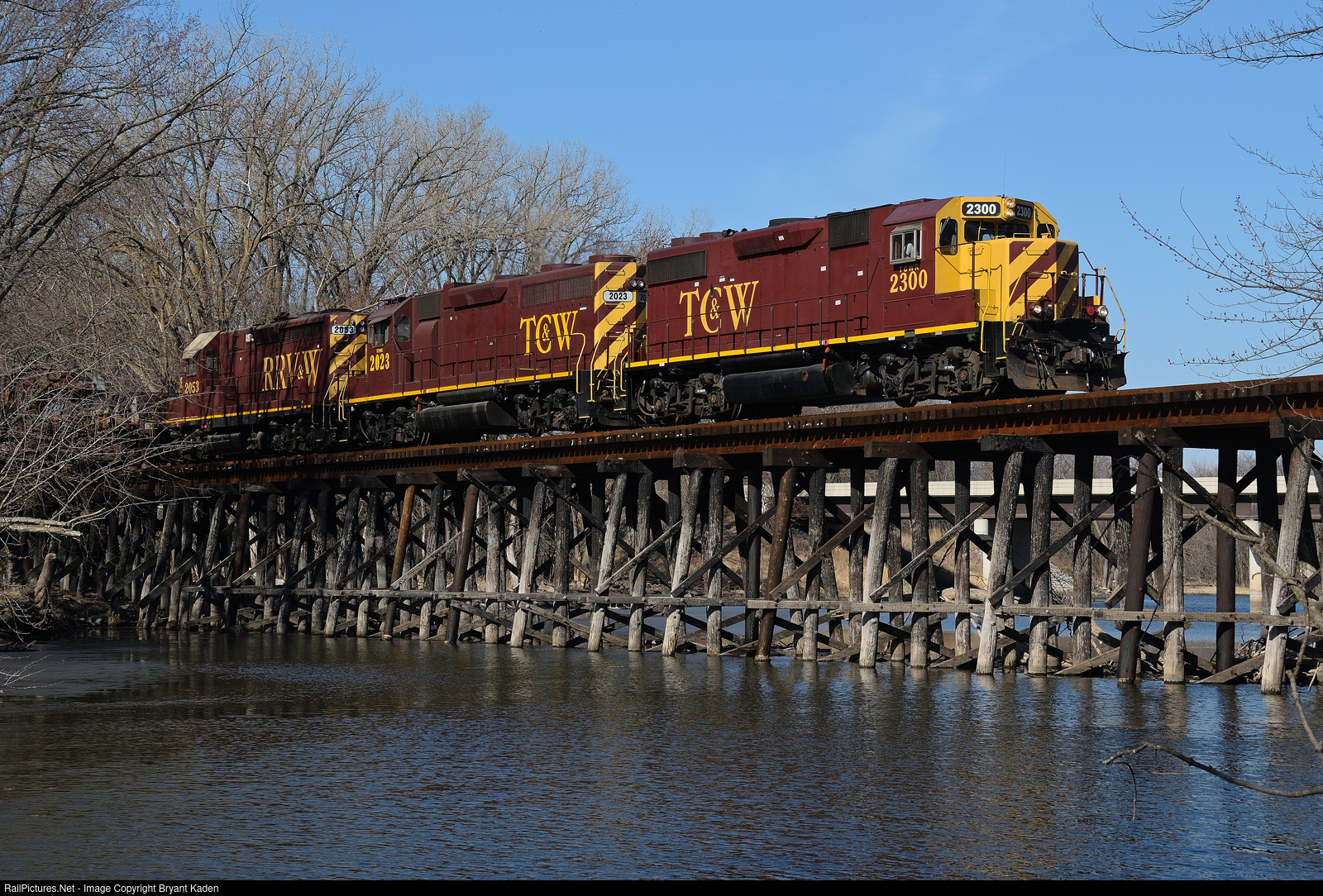 An eastbound train behind both of Twin Cities & Western's former Kennecott Copper GP39-2s, plus RRVW 2053, crosses the Sulphur Lake trestle near Morton, MN.