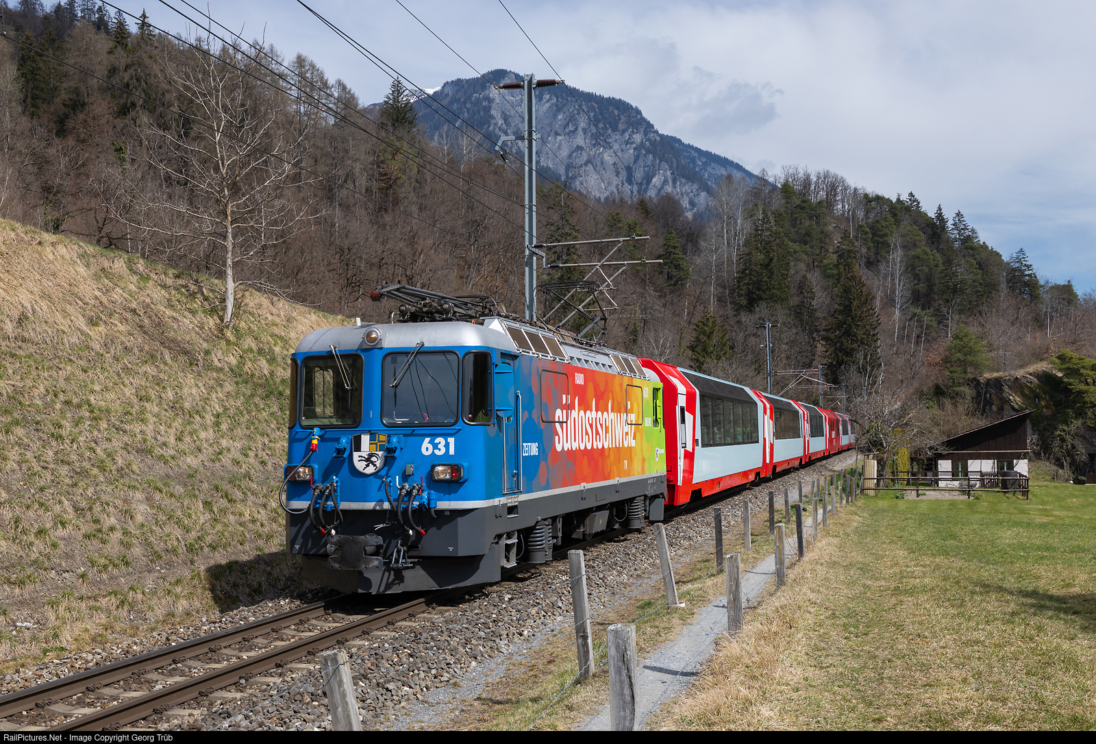| Ge 4/4 II # 631 of the Rhaetian Railway in the colorful "Südostschweiz" (newspaper) paint scheme pulls the PE 925 GLACIER EXPRESS from St.Moritz to Zermatt, on the leg from Chur to Disentis, between Reichenau-Tamins and Trin. |
