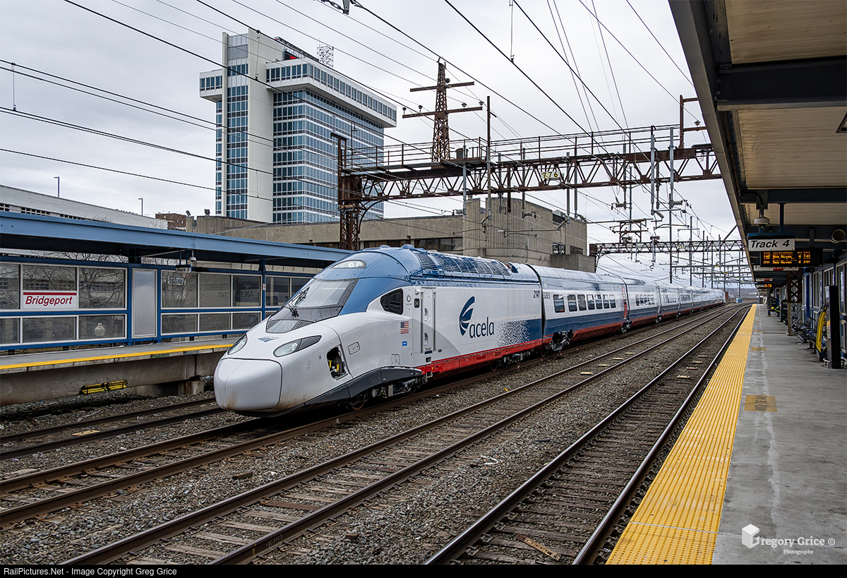 On a gloomy March 3rd, 2025, Amtrak Alstom Avelia Liberty (Acela II) Trainset #14 (with powercars 2141/2104) heads west through Bridgeport, Connecticut as it makes its way down the New Haven Line.