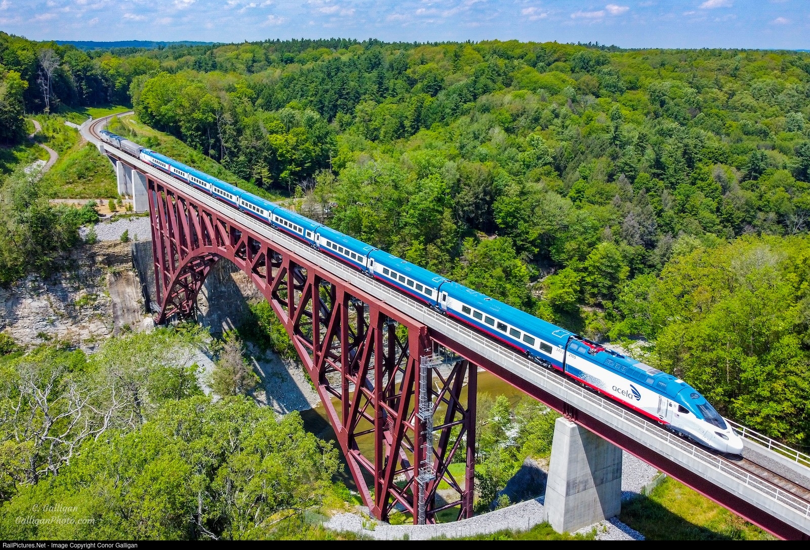 Amtrak Avelia Liberty Delivery train 898 crosses the Portageville Viaduct with a NextGen Acela trainset for the Northeast Corridor.