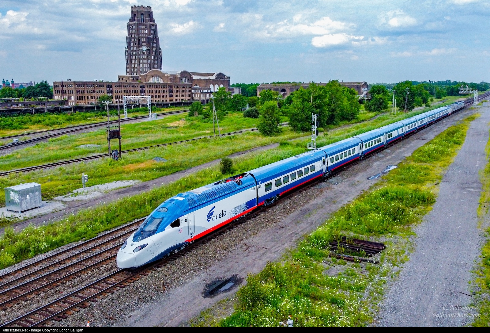 Amtrak Avelia Liberty Delivery train 898 passes the Buffalo Central Terminal with a NextGen Acela trainset for the Northeast Corridor.