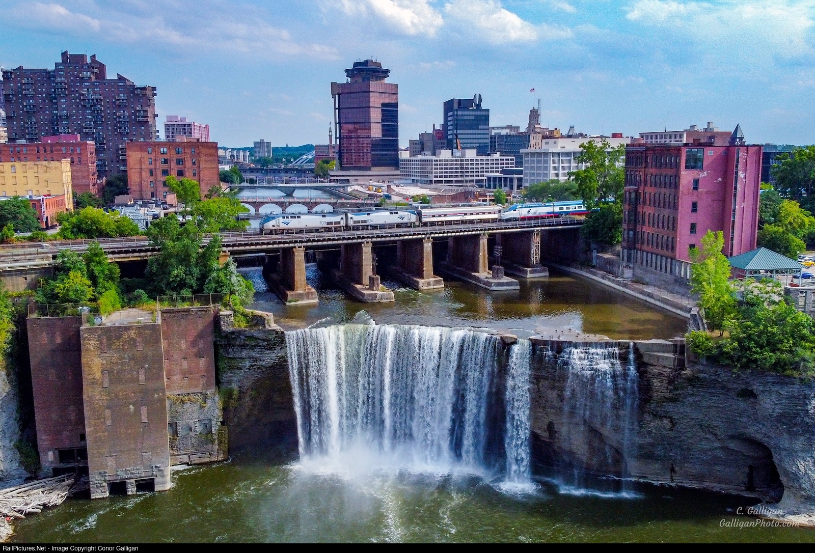 | Amtrak Avelia Liberty Delivery train 898 crosses over the High Falls in Rochester, NY with a NextGen Acela trainset for the Northeast Corridor. |