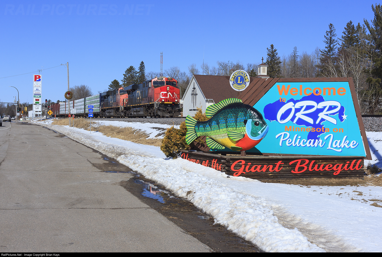 Orr's giant bluegill has the best view to see all the traffic passing on the CN Rainy Subdivision mainline. Minnesota has many giant roadside fish. This bluegill's name is Billy.