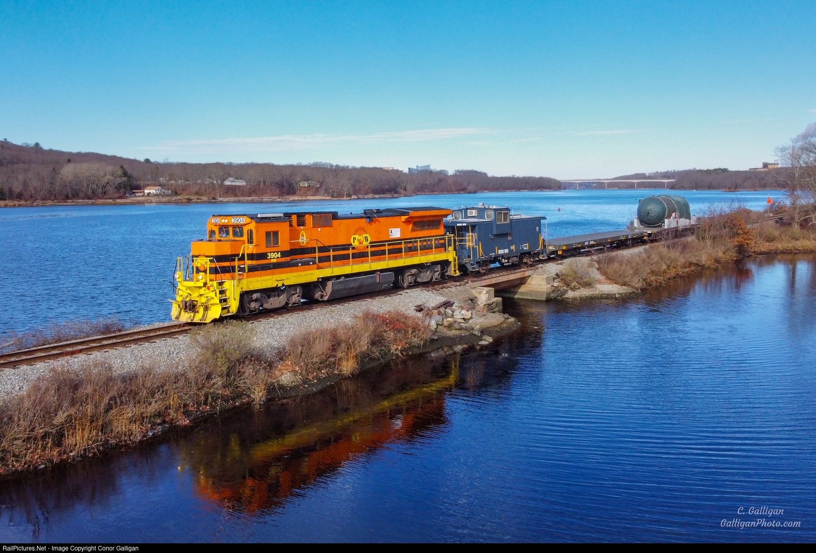 | Providence and Worcester Train NR-4 crosses over Stoddard Cove in Ledyard, CT with a shipment for General Dynamics Electric Boat in Groton, CT. These high profile moves transport Nuclear components used to construct submarines, and require a military escort caboose. |