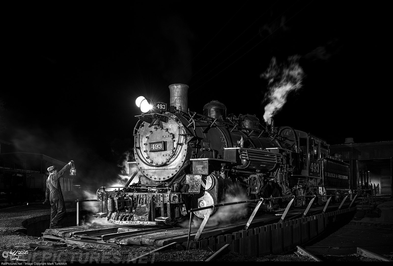 Durango & Silverton 493 is lead onto the Durango Turntable by a nighttime roundhouse crew member on a cool spring night.
